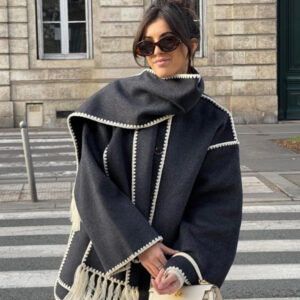 New wool blend coat fringed scarf collar loose woolen coat